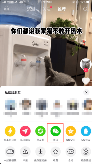 当遇到想要分享的视频时,可以点击视频又下角的箭头图标,打开后可以看到微信好友这个图标,点击之后会出现复制口令发给好友这个选项,点击之后就会自动跳转到微信界面,点击想要分享的好友即可,口令是自动复制到剪贴板的,打开对话框就能发给好友,好友复制口令打开抖音后就能看到分享的视频。